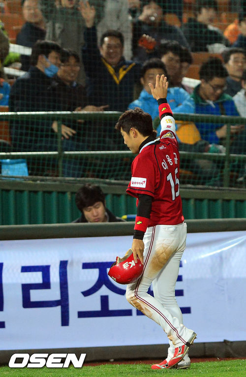 5일 오후 부산 사직구장에서 열린 '2013 한국야쿠르트 세븐 프로야구' 롯데 자이언츠와 KIA 타이거즈의 경기 7회초 2사 1,2루 통산 1000안타를 친 이용규가 관중들을 향해 인사를 하고 있다.