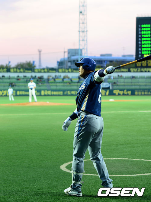 5일 오후 대구시민운동장 야구장에서 열린 2013 한국야쿠르트 세븐프로야구 삼성 라이온즈와 NC 다이노스의 경기, 1회초 NC 이호준이 대기 타석에서 배트를 휘두르고 있다.