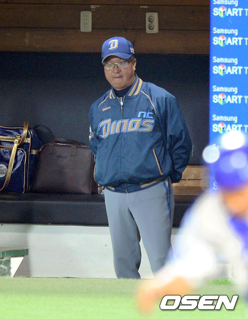 5일 오후 대구시민운동장 야구장에서 열린 2013 한국야쿠르트 세븐프로야구 삼성 라이온즈와 NC 다이노스의 경기, 8회초 NC 김경문 감독이 덕아웃에서 경기를 바라보고 있다.