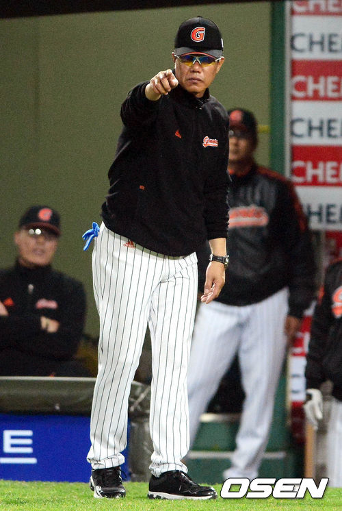 5일 오후 부산 사직구장에서 열린 '2013 한국야쿠르트 세븐 프로야구' 롯데 자이언츠와 KIA 타이거즈의 경기 8회말 2사 만루 김시진 감독이 대타 박준서로 교체하겠다는 제스처를 주심에게 보내고 있다.