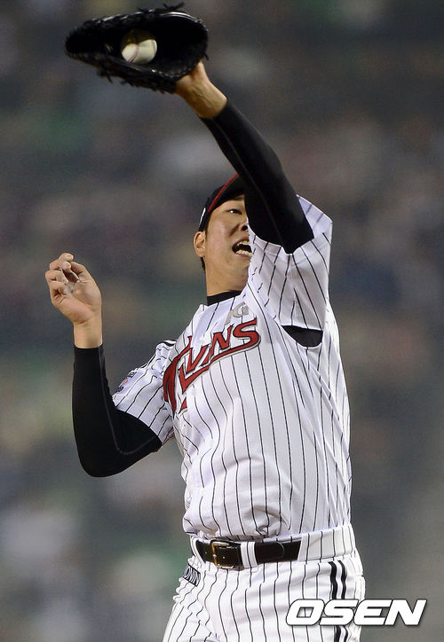 5일 오후 서울 잠실구장에서 열린 '2013 한국야쿠르트 세븐 프로야구' LG 트윈스와 두산 베어스의 경기, 6회초 1사 1루 LG 유원상이 두산 양의지의 타구를 잡아내고 있다.