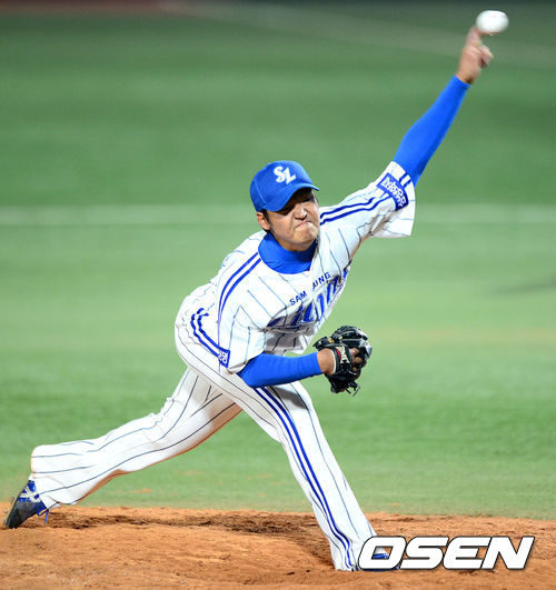 5일 오후 대구시민운동장 야구장에서 열린 2013 한국야쿠르트 세븐프로야구 삼성 라이온즈와 NC 다이노스의 경기, 9회초 삼성 백정현이 힘차게 공을 던지고 있다.