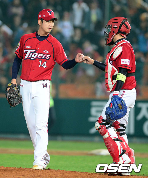 5일 오후 부산 사직구장에서 열린 '2013 한국야쿠르트 세븐 프로야구' 롯데 자이언츠와 KIA 타이거즈의 경기 종료 후 진해수와 차일목이 하이파이브를 하고 있다.