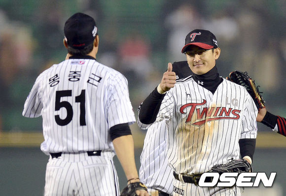 경기 종료 후 승리를 거둔 LG 박용택이 엄지를 세우며 봉중근과 기뻐하고 있다. / youngrae@osen.co.kr