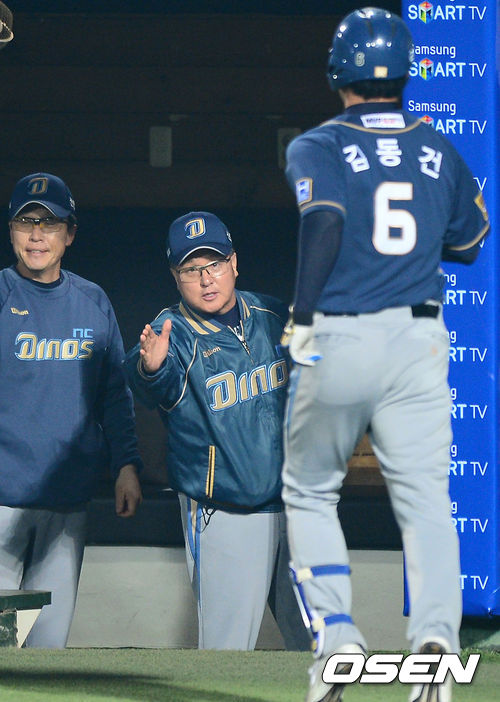 9회초 2사에서 NC 김동건이 좌월 솔로 홈런을 치고 덕아웃에서 김경문 감독의 축하를 받고 있다. /sunday@osen.co.kr