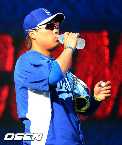 6일 오전(이하 한국시간) 미국 캘리포니아 로스앤젤레스 다저스타디움에서 LA 다저스와 피츠버그 파이어리츠와의 경기가 열릴 예정인 가운데 경기 전 류현진이 훈련 중 물을 마시고 있다.
