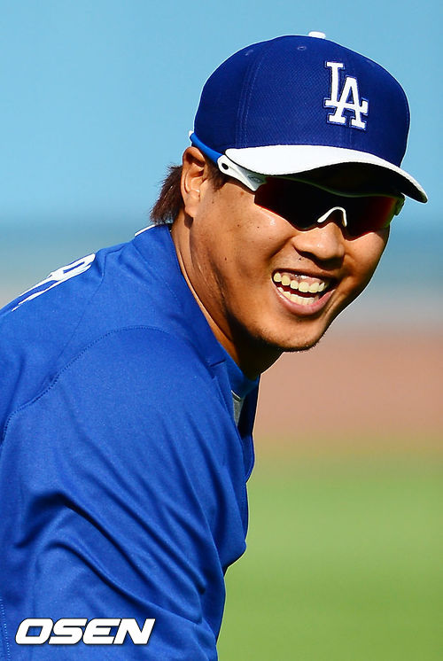 6일 오전(이하 한국시간) 미국 캘리포니아 로스앤젤레스 다저스타디움에서 LA 다저스와 피츠버그 파이어리츠와의 경기가 열릴 예정인 가운데 경기 전 류현진이 파트너와 캐치볼 중 볼을 놓친 후 웃고 있다.