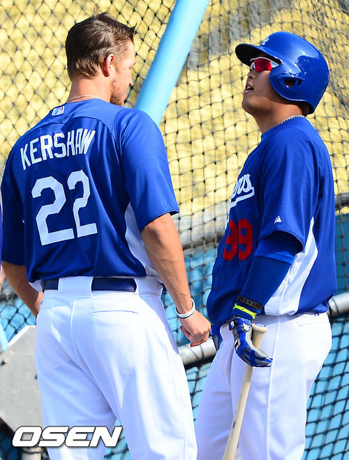 6일 오전(이하 한국시간) 미국 캘리포니아 로스앤젤레스 다저스타디움에서 LA 다저스와 피츠버그 파이어리츠와의 경기가 열릴 예정인 가운데 경기 전 타격연습을 마치고 나온 류현진과 클레이튼 커쇼와 얘기를 나누고 있다.