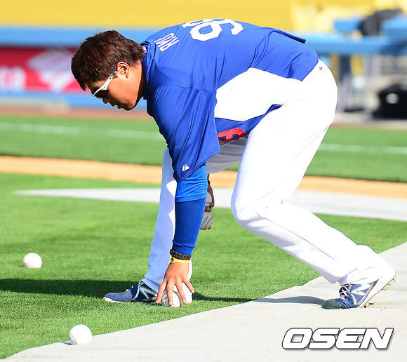 6일 오전(이하 한국시간) 미국 캘리포니아 로스앤젤레스 다저스타디움에서 LA 다저스와 피츠버그 파이어리츠와의 경기가 열릴 예정인 가운데 경기 전 LA 다저스 류현진이 볼 정리를 하고 있다.