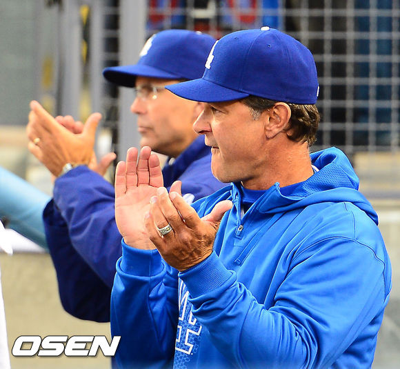 LA 다저스 돈 매팅리 감독이 박수를 보내고 있다.