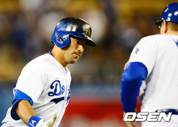2회말 2사 주자 없는 상황에서 피츠버그 선발 조나단 산체스를 상대로 LA 다저스 안드레 이디어가 선제 솔로포를 날린 후 그라운드를 돌고 있다.
