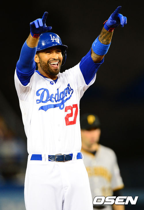 6회말 무사 주자 1루 맷 켐프가 중전 1타점 적시타를 날린 후 2루에서 기뻐하고 있다.
