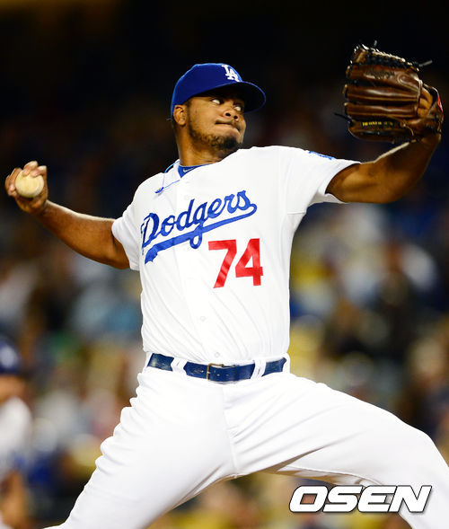 8회초 LA 다저스 켄리 잰슨이 힘차게 공을 뿌리고 있다.