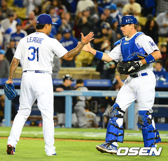 경기를 마치고 LA 다저스 브랜든 리그와 A.J 엘리스가 하이파이브를 하고 있다. / rumi@osen.co.kr