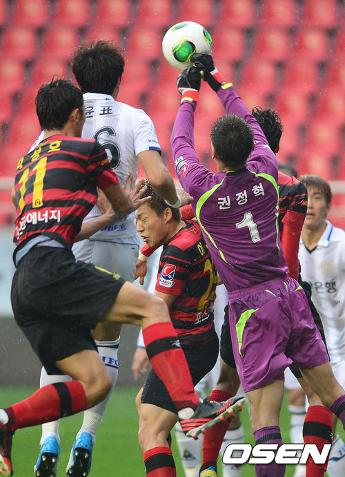 6일 오후 포항 스틸야드에서 열린 '2013 K리그 클래식' 포항 스틸러스와 인천 유나이티드의 경기 전반 권정혁이 문전으로 올라오는 볼을 쳐내고 있다.