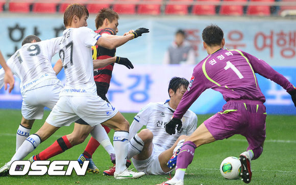 6일 오후 포항 스틸야드에서 열린 '2013 K리그 클래식' 포항 스틸러스와 인천 유나이티드의 경기 전반 포항 이명주가 슛 기회를 놓치고 있다.