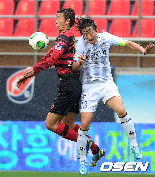6일 오후 포항 스틸야드에서 열린 '2013 K리그 클래식' 포항 스틸러스와 인천 유나이티드의 경기 전반 포항 고무열이 인천 박태민과 공중볼 다툼을 하고 있다.