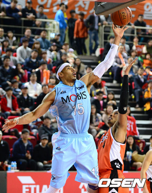 6일 오후 인천 삼산체육관에서 열린 'KB 국민카드 2012-2013 프로농구' 4강 플레이오프 울산 모비스와 인천 전자랜드의 경기, 3쿼터 모비스 문태영이 문태종의 슛블록을 피해 슛을 시도하고 있다.