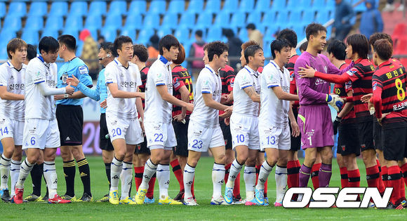 6일 오후 포항 스틸야드에서 열린 '2013 K리그 클래식' 포항 스틸러스와 인천 유나이티드의 경기 종료 후 선수들이 악수를 나누고 있다.
