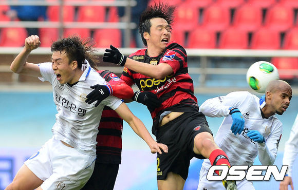 6일 오후 포항 스틸야드에서 열린 '2013 K리그 클래식' 포항 스틸러스와 인천 유나이티드의 경기 후반 안재준(왼쪽)의 머리에 맞은 공이 디오고 머리 뒤로 향하고 있다.