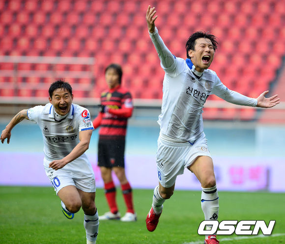 6일 오후 포항 스틸야드에서 열린 '2013 K리그 클래식' 포항 스틸러스와 인천 유나이티드의 경기 후반 손대호가 골을 넣은 후 기뻐하고 있다.