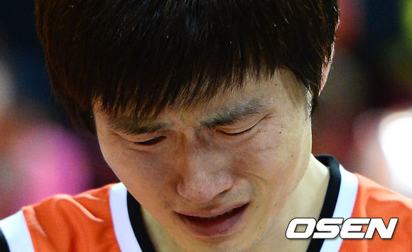 경기 종료 후 전자랜드 강혁이 은퇴식에서 소감을 말하며 눈물을 흘리고 있다. /sunday@osen.co.kr