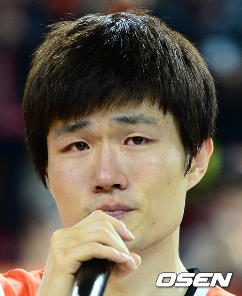 경기 종료 후 전자랜드 강혁이 은퇴식에서 소감을 말하며 눈물을 흘리고 있다. /sunday@osen.co.kr