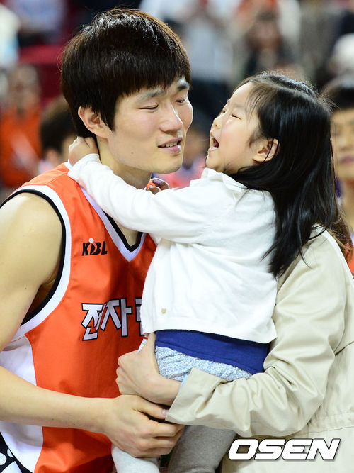 경기 종료 후 전자랜드 강혁이 은퇴식에서 딸에게 볼키스를 받고 있다. /sunday@osen.co.kr