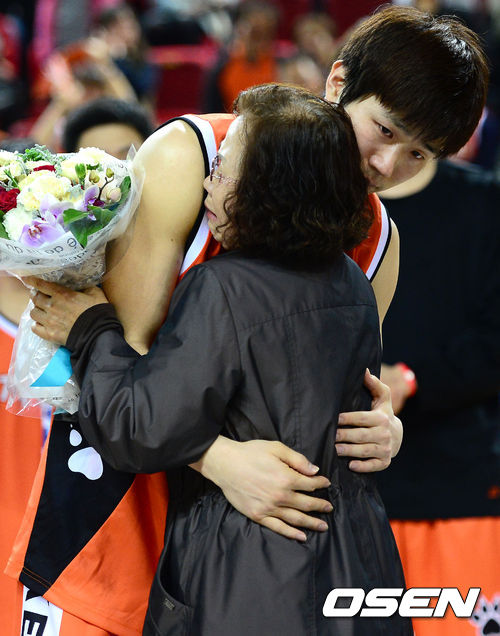 경기 종료 후 전자랜드 강혁이 은퇴식에서 어머니와 포옹을 하고 있다. /sunday@osen.co.kr