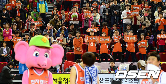 경기 종료 후 전자랜드 강혁이 은퇴식에서 팬들이 응원문구가 적힌 종이를 들고 응원하고 있다. /sunday@osen.co.kr