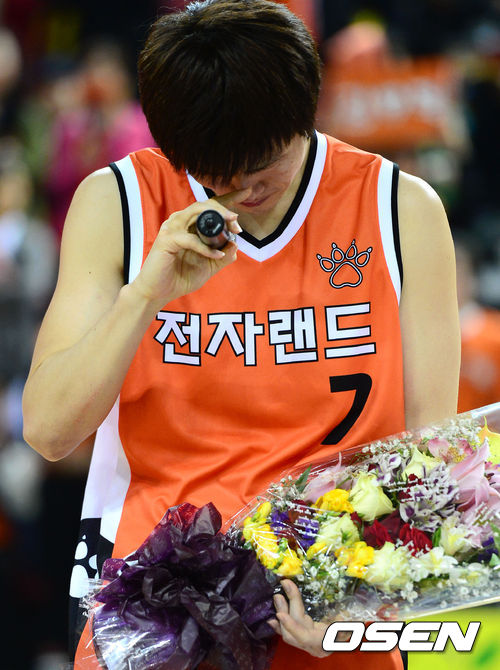 경기 종료 후 전자랜드 강혁이 은퇴식에서 소감을 말하며 눈물을 흘리고 있다. /sunday@osen.co.kr
