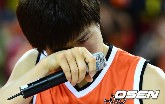 경기 종료 후 전자랜드 강혁이 은퇴식에서 소감을 말하며 눈물을 흘리고 있다. /sunday@osen.co.kr