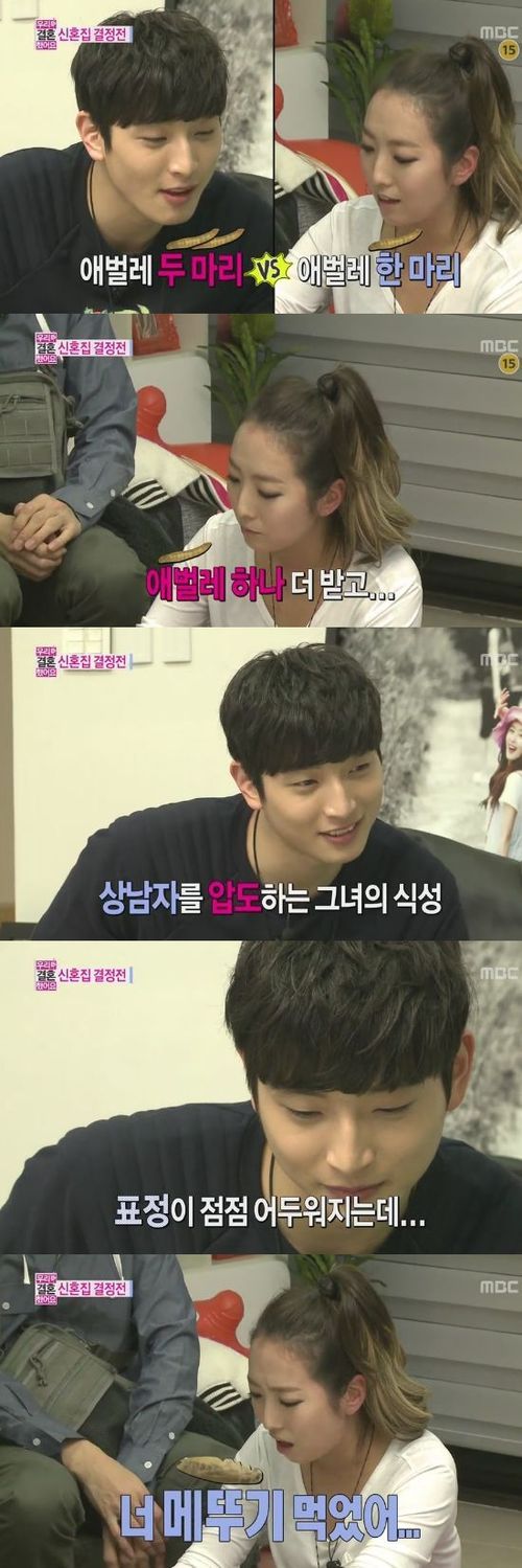 정인과 정진운은 6일 오후 방송된 MBC 예능프로그램 ‘우리 결혼했어요 4’에서 원하는 신혼집을 선택하기 위해 벌레 많이 먹기 대결을 펼쳤다.