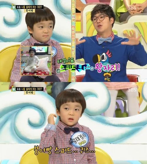 이날 '붕어빵'은 '요즘 나를 설레게 하는 것들'이라는 주제로 진행된 가운데, 홍인규가 아들을 설레게 하는 것으로 '붕어빵'을 지목한 것. 그는 "태경이가 집에 있는 이불을 다 꺼내서 쌓아놓고 그 위에 앉아 '스피드 퀴즈' 왕의 자리라고 한다"며 "말 못하는 동생한테 '스피드 퀴즈'를 내고 못 알아듣는다며 속상해 한다. MC 흉내도 낸다"고 밝혔다. '붕어빵'에 대한 남다른 사랑으로 프로그램 속 코너를 집에서도 연습하는 아들의 모습을 이야기 한 것.