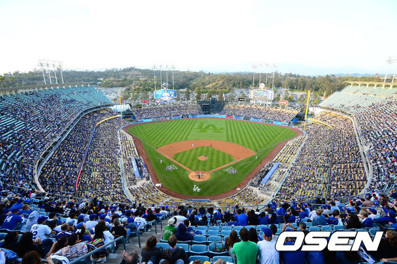 다저스타디움에 수많은 야구팬들이 경기를 즐기고 있다.