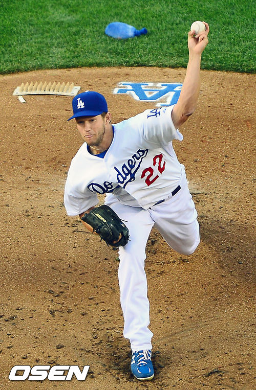 LA 다저스 선발 클레이튼 커쇼가 힘차게 공을 뿌리고 있다.