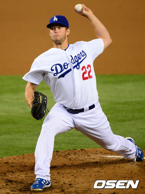 LA 다저스 선발 클레이튼 커쇼가 힘차게 공을 뿌리고 있다.