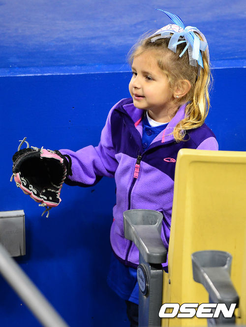 1루 쪽에서 응원을 하던 현지 꼬마아이가 글러블을 들고 자리에서 일어서고 있다.