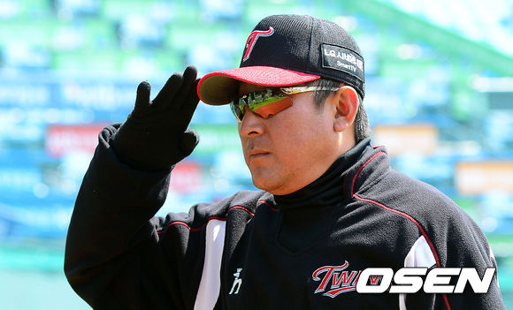 경기에 앞서 LG 김기태 감독이 취재진에 인사를 하고 있다.