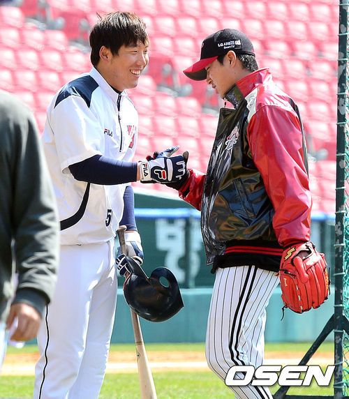경기에 앞서 두산 김현수와 LG 우규민이 인사를 나누고 있다.