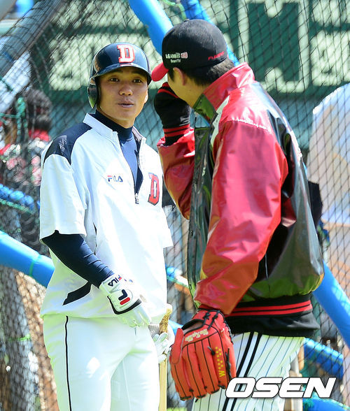 경기에 앞서 두산 이종욱과 LG 우규민이 인사를 나누고 있다.
