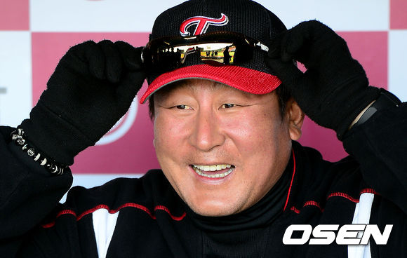 경기에 앞서 LG 김기태 감독이 취재진과 이야기를 나누며 미소짓고 있다.