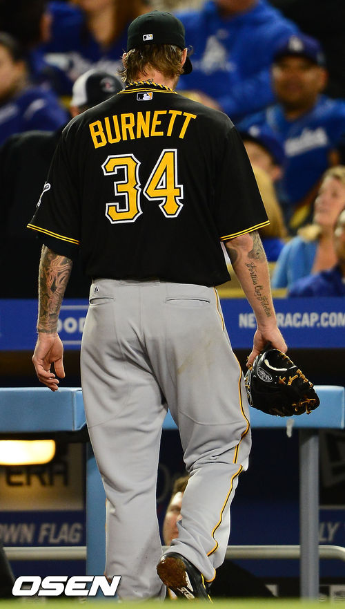 피츠버그 선발 A.J 버넷이 7회말 1사 주자 1,2루에 교체되고 있다.