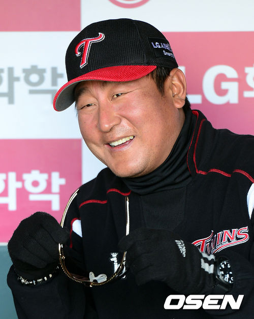 경기에 앞서 LG 김기태 감독이 취재진과 이야기를 나누며 미소짓고 있다.