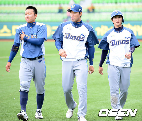 7일 오후 대구구장에서 열리는 '2013 한국야쿠르트 세븐 프로야구' 삼성 라이온즈와 NC 다이노스의 경기 시작 전 훈련에서 김태군, 조평호, 이상호가 러닝을 마친 후 걸어가고 있다.
