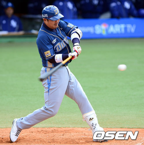 7일 오후 대구구장에서 열린 '2013 한국야쿠르트 세븐 프로야구' 삼성 라이온즈와 NC 다이노스의 경기 4회초 1사 3루 이호준이 희생플라이를 치고 있다.