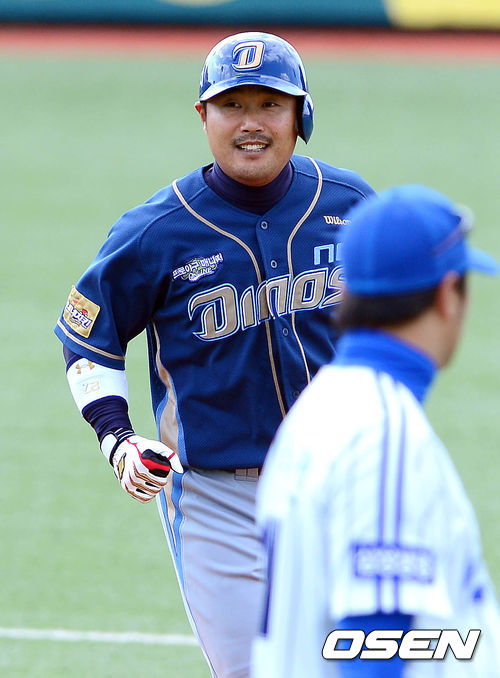 7일 오후 대구구장에서 열린 '2013 한국야쿠르트 세븐 프로야구' 삼성 라이온즈와 NC 다이노스의 경기 4회초 1사 3루 이호준이 희생플라이를 치고 덕아웃으로 돌아오면서 미소를 짓고 있다.