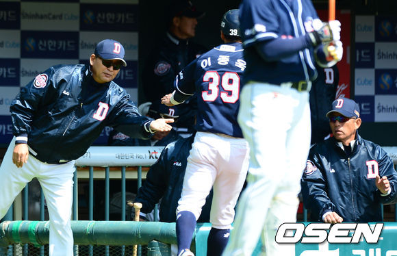 1회초 무사 1,3루에서 두산 김현수의 내야땅볼에 이종욱이 홈을 밟고 김진욱 감독과 더그아웃에서 하이파이브를 하고 있다.