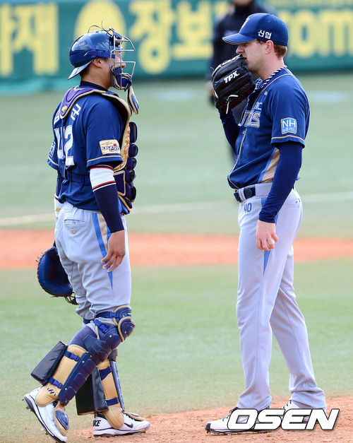 7일 오후 대구구장에서 열린 '2013 한국야쿠르트 세븐 프로야구' 삼성 라이온즈와 NC 다이노스의 경기 5회말 1사 1,3루 아담과 김태군이 마운드에서 이야기를 나누고 있다.