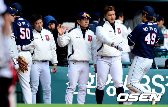 6회말 수비를 마치고 두산 홍성흔이 동료선수들을 격려하고 있다.